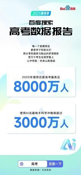 2025年百度高考服务近8000万人,百度搜索依然是万千学子了解报考信息的首选,超3000万人使用AI志愿助手和高考大数据,科学填报志愿。