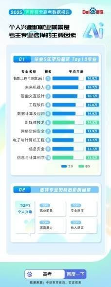 数据显示,考生在选择专业时,就业前景和个人兴趣,成为两大核心决策因素。理想与现实,在志愿填报这一刻需要找到平衡点。从毕业5年后平均薪资看,智能工程与创意设计、未来机器人、智能交互设计等前沿科技专业,平均薪资领跑全榜,成为名副其实的“钱”途担当。